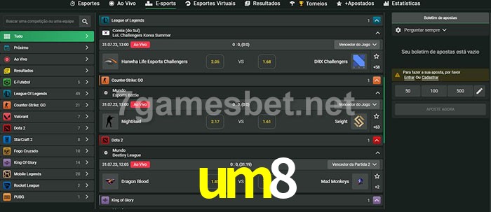 O um8 oferece uma grande seleção de opções de apostas em e-sports com probabilidades competitivas